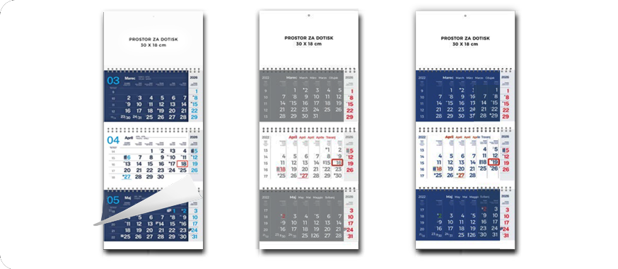 Tridelni koledar 2026 Nudimo vam širok izbor tridelnih koledarjev, ki so odličen pripomoček za planiranje dogovorjenih sestankov. Sestavljen je iz koledarja za tekoči mesec, pretekli mesec in prihajajoči mesec. Tekoči dan je označen z rdečim okvirčkom. Je praktično promocijsko darilo. Zgornjo podlogo koledarja lahko potiskamo z vašim logotipom (min. 10 koledarjev). Pošljite povpraševanje! |