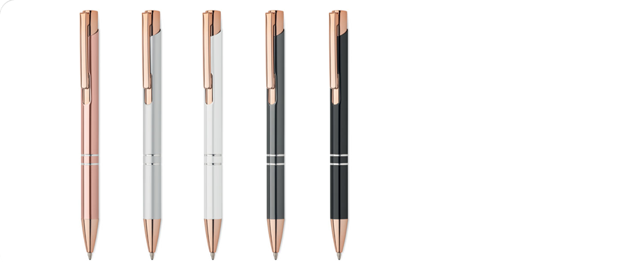 Kemično pisalo | Kovinsko V podjetju Matisk vam nudimo različne modele in barve kemičnih pisal. Ravno kovinski pa s svojo težo in otipom ustvarjajo večjo žlahtnost in kvaliteto v primerjavi s plastičnimi pisali. Na vašo željo vam pisala lahko tudi potiskamo ali lasersko graviramo. Pošljite povpraševanje s količino in pripravili vam bomo ponudbo. Pisala so pakirana po 50 ali 100 kos. |